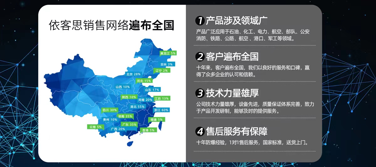 依客思防爆專注于防爆產(chǎn)品的研發(fā)、生產(chǎn)與銷售,主要產(chǎn)品有:防爆操作柱、BXCQ防爆靜電釋放儀、BZC系列防爆操作柱、不銹鋼現(xiàn)場操作箱、BXM(D)防爆照明(動力)配電箱、BXX防爆檢修箱、BXJ防爆接線箱、LED防爆燈、防爆管件、防爆風機等產(chǎn)品,型號規(guī)格齊全,廣泛適用于煤炭、電力、醫(yī)藥、石油、化工、航空等領域。我公司產(chǎn)品質(zhì)量過硬,價格實惠,銷售范圍廣,且與各大型企業(yè)建立了良好的合作關系,同時還遠銷中、東亞和北美等地區(qū),深受用戶喜愛與青睞。